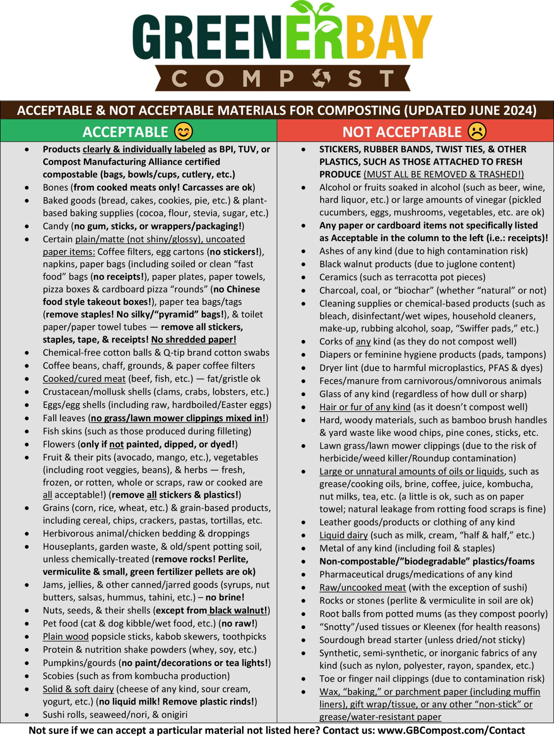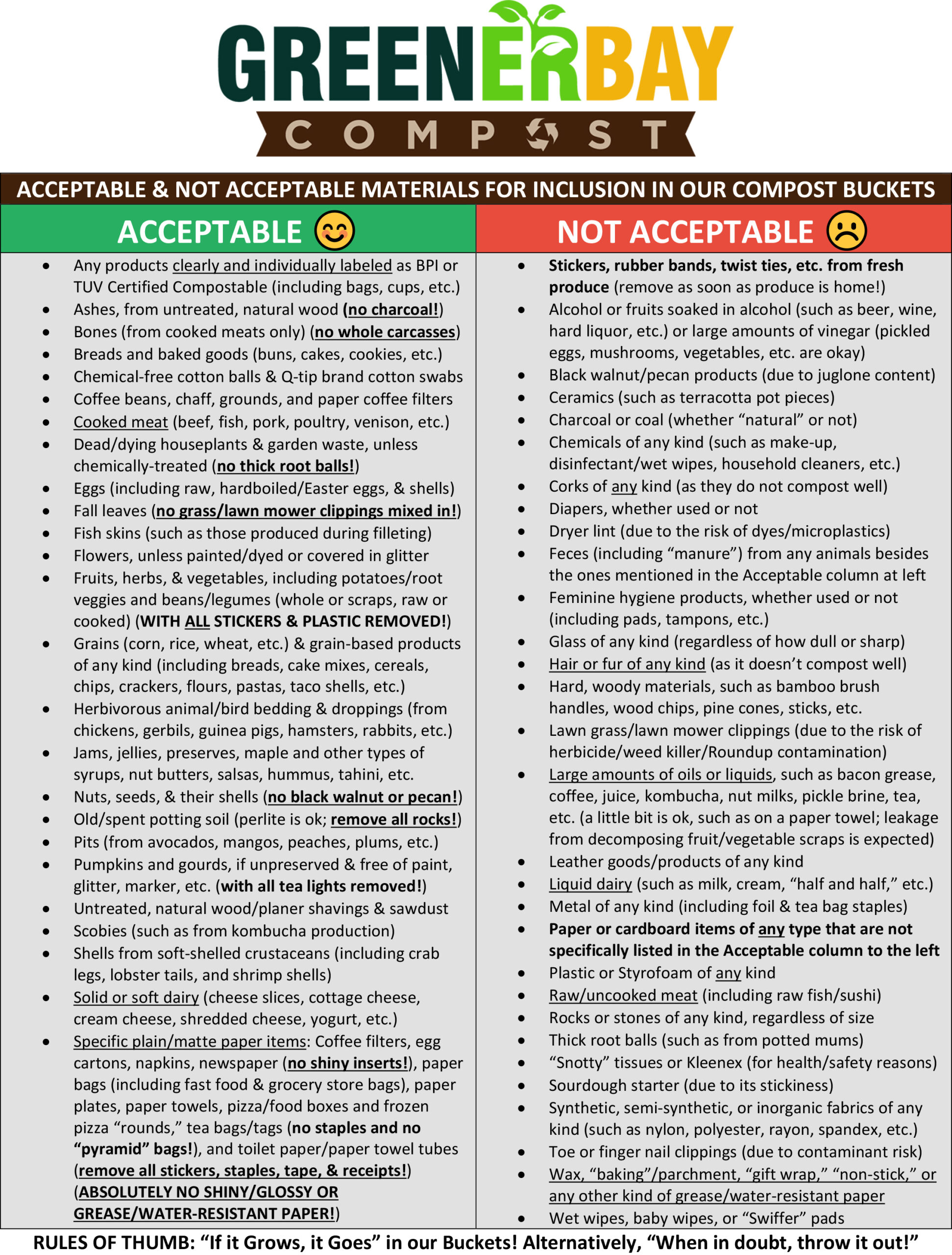 Please click the image below to view and/or save/download/print a PDF version of our List of Acceptable and Not Acceptable Materials for Composting.
